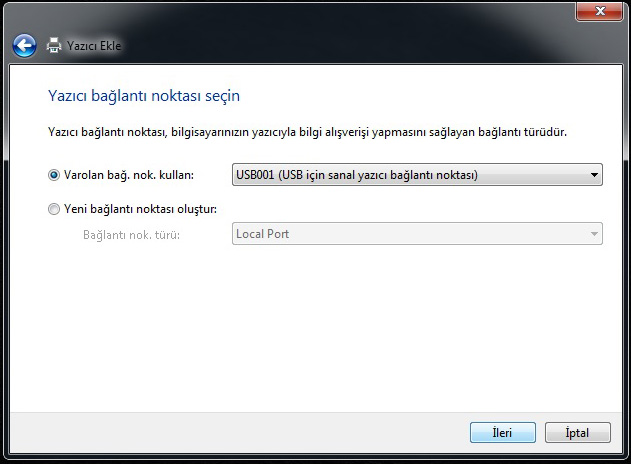 3. Bağlantı noktasını USB001 olarak seçiniz, Eğer farklı bir bağlantı noktasına bağlı ise daha sonra bağlantı noktasını değiştirebilir, USB002, USB003 gibi farklı bir bağlantı noktası seçebilirsiniz.