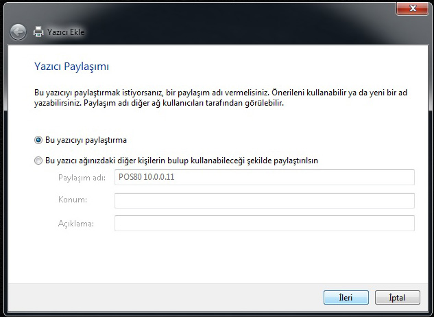 10. Bu ekranda tercihe göre BU YAZICIYI PAYLAŞTIR ya da PAYLAŞTIRMA seçeneğini seçip, İLERİ butonuna tıklayınız.